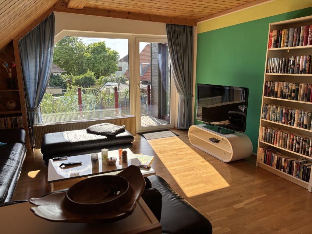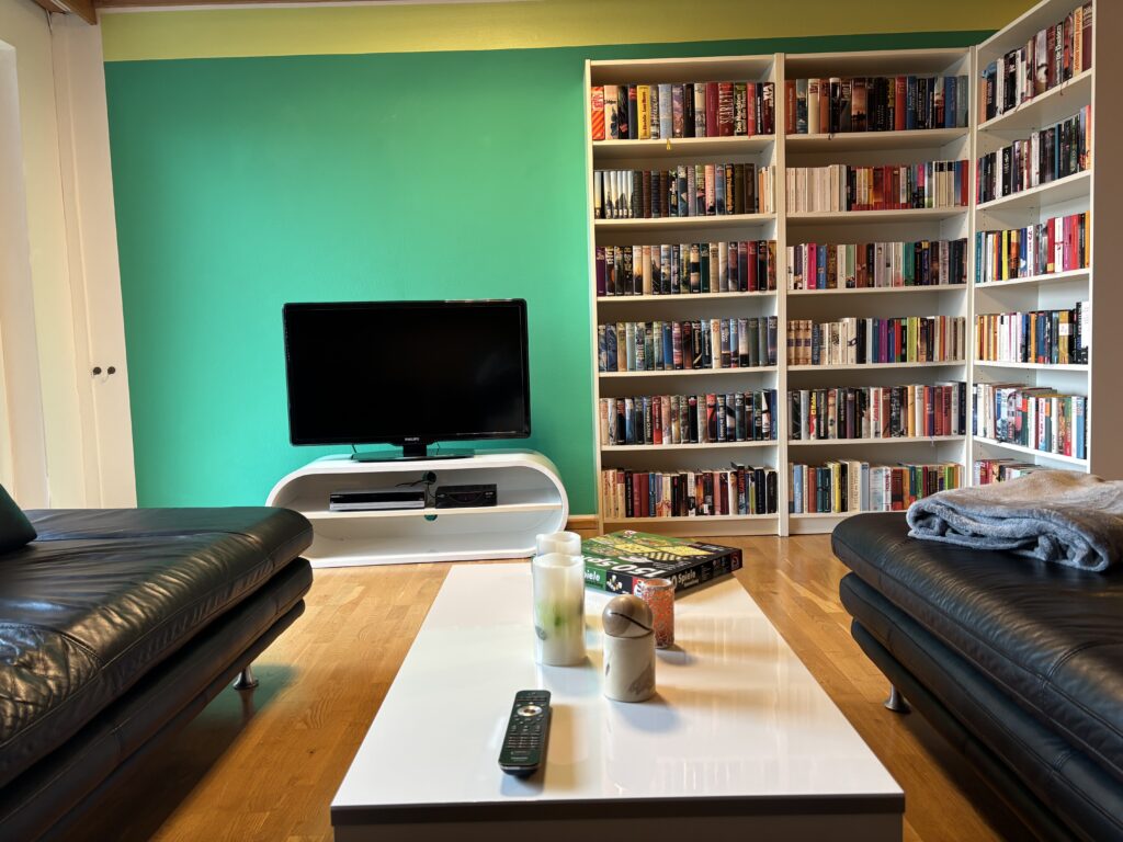 Das Wohnzimmer bietet neben einer großen, gemütlichen Couch einen TV und Büchern zum entspannen einen Arbeitsplatz.