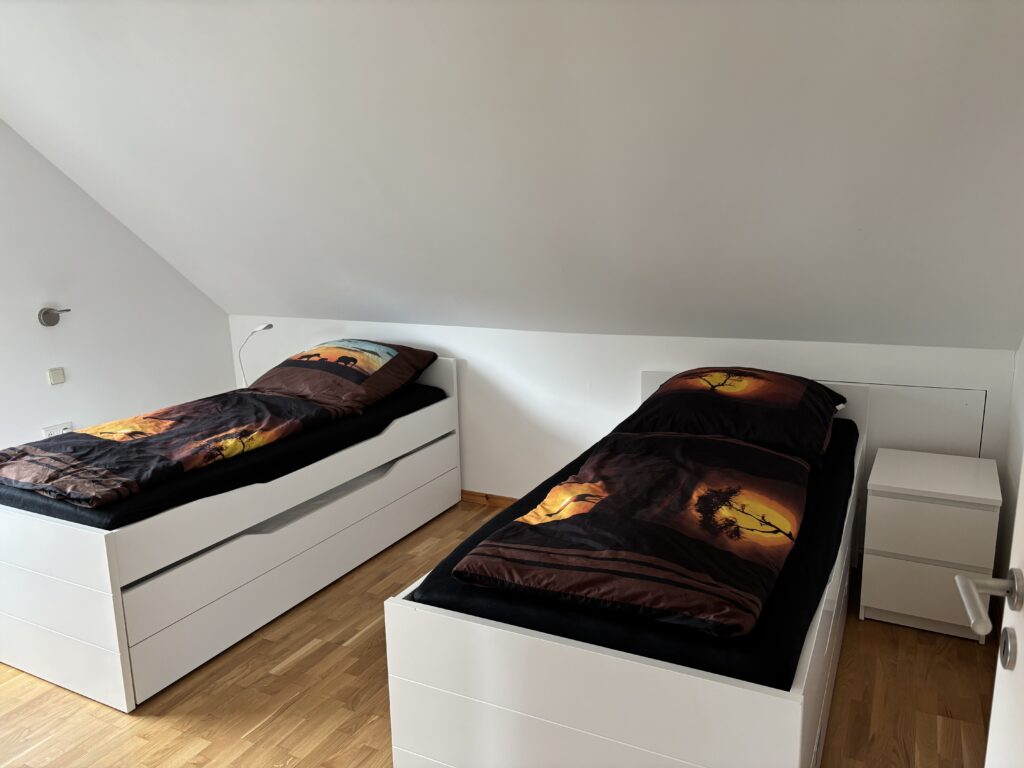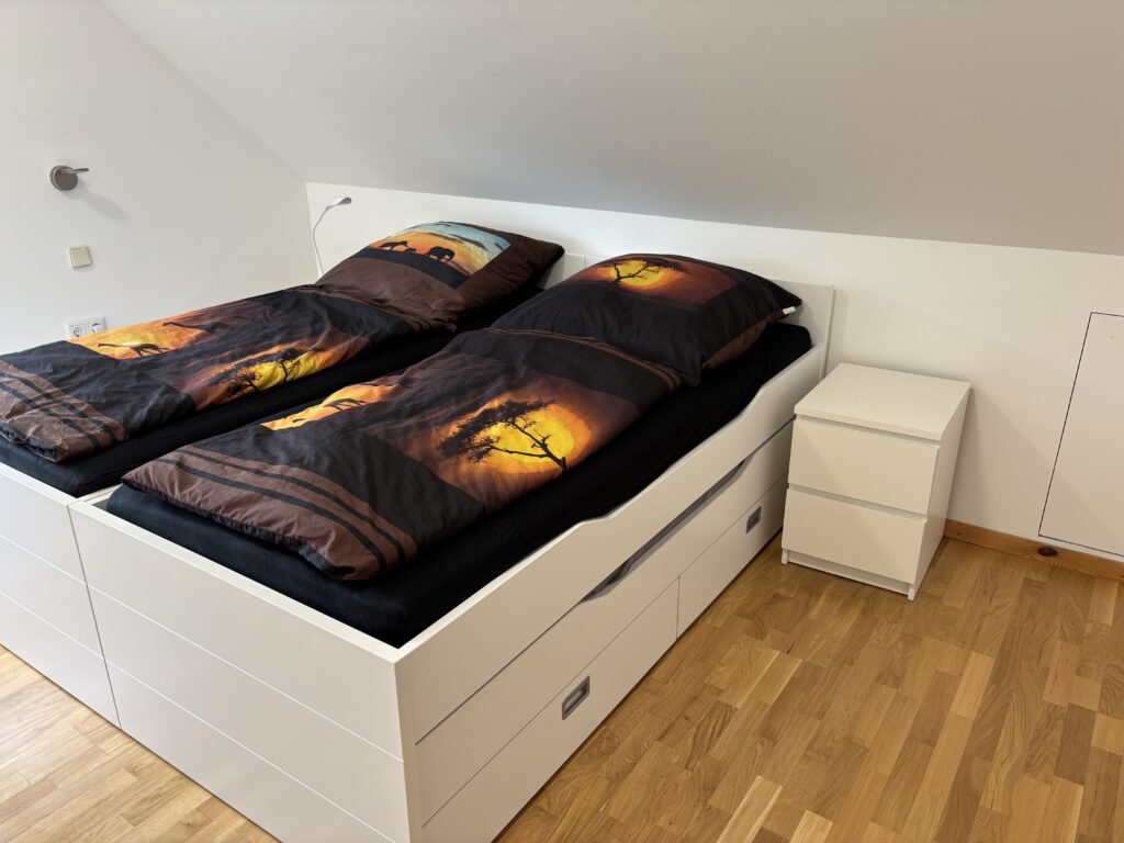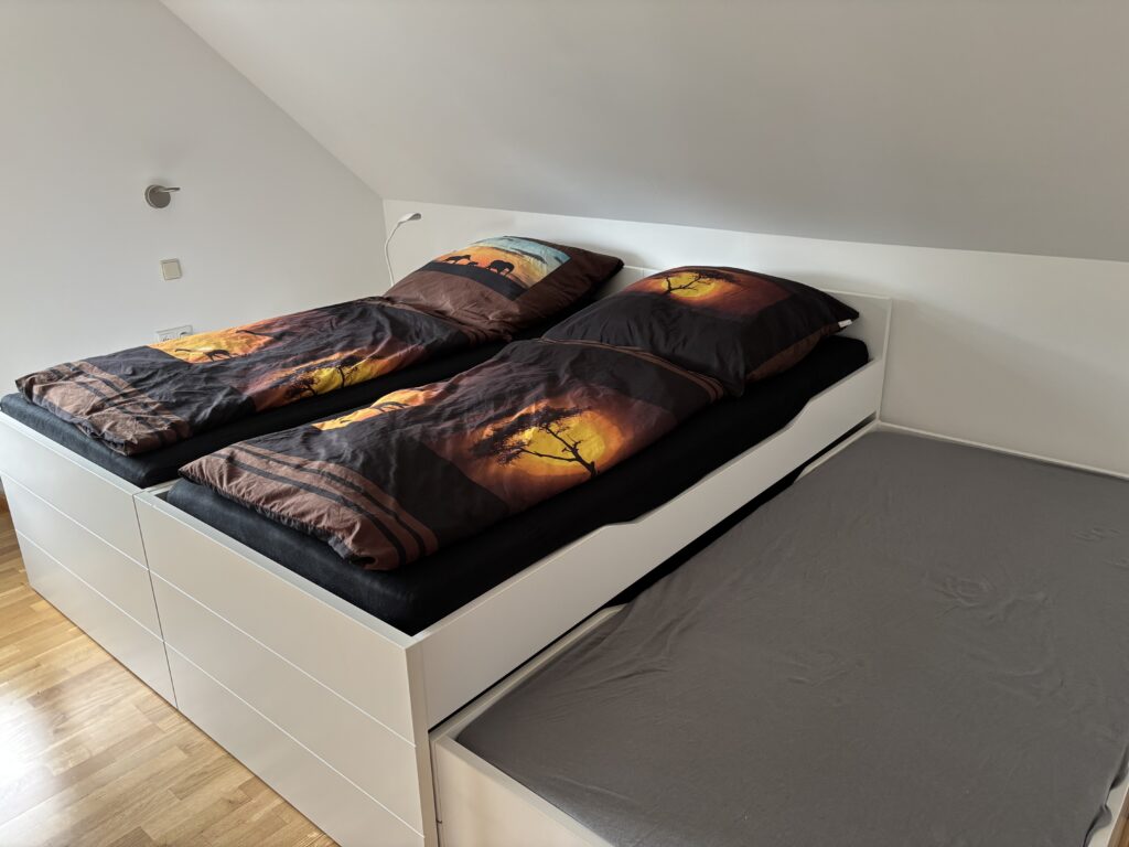 Die Betten können als Doppelbett oder einzeln genutzt werden. Für einen weiteren, kleinen Gast kann ein zusätzliches Bett ausgezogen werden. Bettwäsche inklusive.
